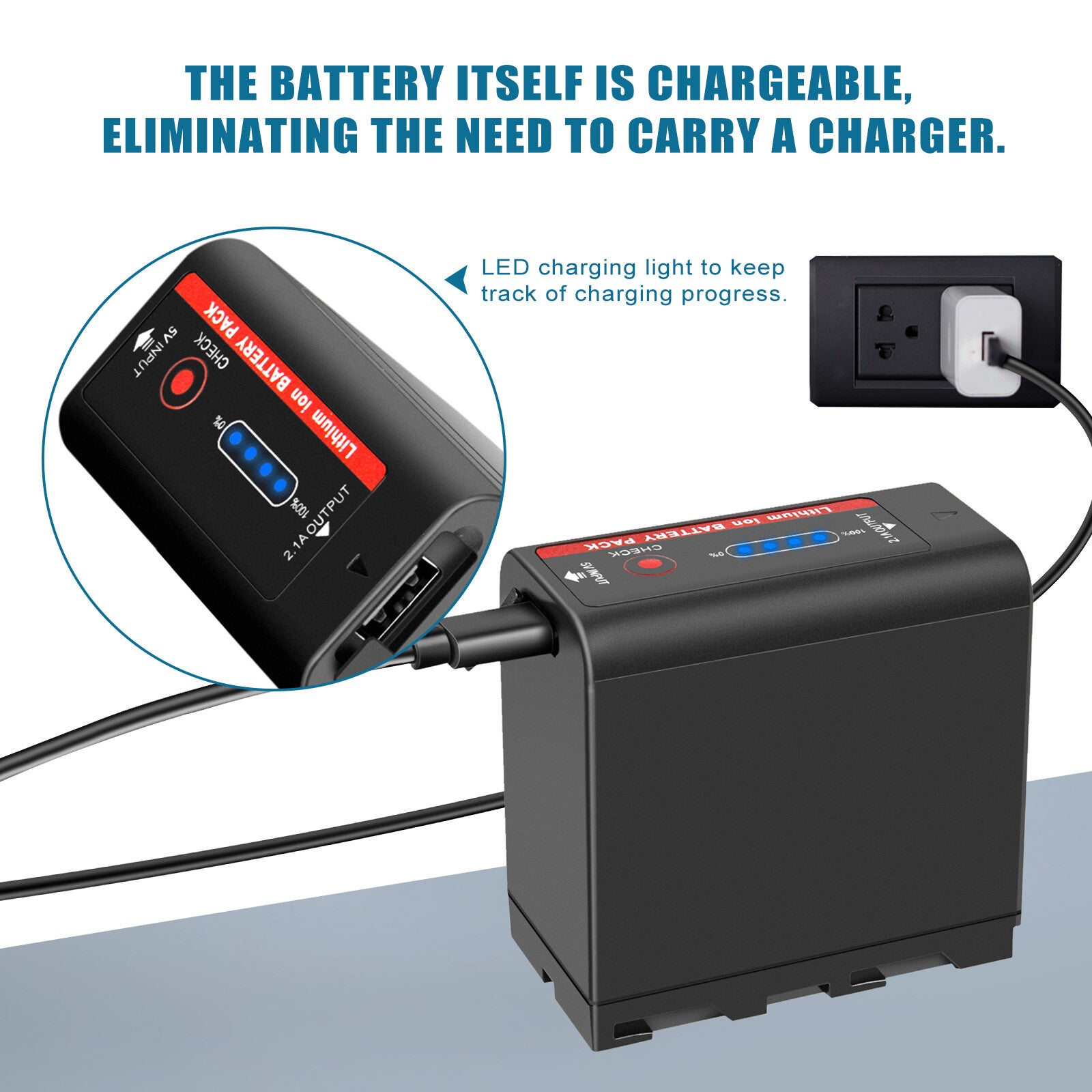 - Geïntegreerde batterij en oplader: u hoeft geen oplader mee te nemen, omdat de batterij zelf een oplaadfunctie heeft waarmee u het laadproces op elk moment kunt volgen.